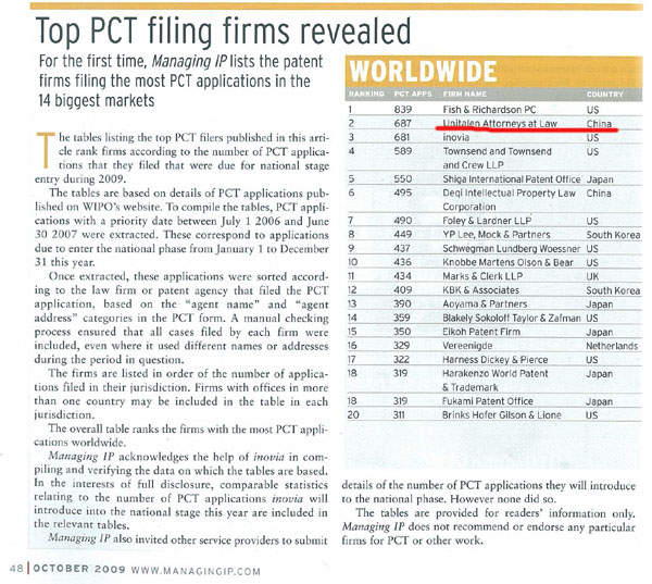 近日,根據全球權威知識產權刊物Managing Intellectual Property (MIP)2009年10月期公布的一份數據顯示,全球PCT申請統計中,在申請日(優先權日)介于2006年7月1日至2007年6月30日之間,30個月的絕限落在2009年1月至2009年12月間的已經公開的PCT申請中,集佳知識產權代理有限公司以687件申請在全球代理機構排名中僅次于一家美國事務所而位列第二,也是中國唯一一家躋身全球前五名的知識產權服務機構。