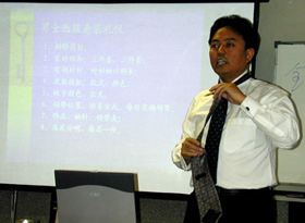 “碰撞精彩生活——集佳職業(yè)形象設計系列講座(一)”成功舉辦后,受到公司廣大女女性員工的歡迎,規(guī)范了女性在工作中的職業(yè)形象,塑造了職業(yè)女性的獨特魅力。為塑造集佳人整體的良好職業(yè)形象,體現(xiàn)集佳人的專業(yè)化、高素質,北京集佳于2003年11月15日在賽特廣場二層會議室內(nèi)為男性員工舉辦了“挖掘自我·煥發(fā)魅力·展現(xiàn)風采”——集佳職業(yè)形象設計系列講座(二)。 盡管講座利用的是周六休息時間,但還是得到了大部分男性員工的支持,有近25名員工參加了本次講座。初冬的北京已經(jīng)滲透出些微寒意,但在集佳講座的現(xiàn)場,輕柔的音樂、最新的秋冬男裝展示以及一杯溫熱香茗,讓溫暖在會場中四溢開來。 本次講座邀請了外交學院外事辦公室副主任、國際交流中心主任文泉老師主講,講座主題圍繞男性著裝、配襯及配套物品、個人儀容、接待禮儀、商務活動中的職業(yè)形象塑造、辦公室禮儀、國際商務禮儀常識等展開,不僅有系統(tǒng)規(guī)范地理論講授,還結合了生動的范例和實物,更好的傳達出良好的職業(yè)形象在實際工作中的重要意義和作用。 為了增強講座的針對性,行政部丁雷為大家做了示范,讓我們感受到花幾分鐘來注意一下細節(jié),就會有截然不同的效果。 文泉老師具有豐富的授課經(jīng)驗,曾赴國家電力總公司國際部、中國建材總公司、東方資產(chǎn)管理公司、江西省科協(xié)、建設部信息中心、浙江省經(jīng)濟學會、中國普天等單位進行國際商務禮儀、職業(yè)形象塑造等培訓,同時,海信集團、廈門國際銀行、德力西集團、重慶電信公司、曲靖卷煙廠等單位的學員都接受過文老師的公開課培訓及企業(yè)內(nèi)訓。