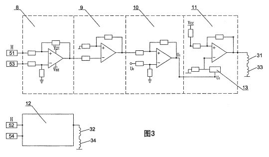 而涉案專(zhuān)利說(shuō)明書(shū)給出了唯一的“具體實(shí)施方式”,即:懸浮體水平運(yùn)動(dòng)控制裝置包括:①帶鐵芯的四個(gè)線圈31、32、33、34;②四個(gè)霍爾元件傳感器(磁性傳感器)51、52、53、54,分成兩組分別控制兩組線圈,進(jìn)而控制懸浮體X、Y方向的自由移動(dòng);③在底座內(nèi)還設(shè)置有控制電路板6,由完全相同的相對(duì)獨(dú)立的控制電路12組成;④控制電路12也僅僅給出一個(gè)具體實(shí)施方式,即傳感器電壓接入減法電路8(檢測(cè)電壓值),經(jīng)放大電路9(信號(hào)放大),與減法電路10的基準(zhǔn)電壓U0進(jìn)行比較,輸出到功放電路;當(dāng)輸出電壓不為0時(shí),進(jìn)行勵(lì)磁電流的調(diào)整。如下圖: