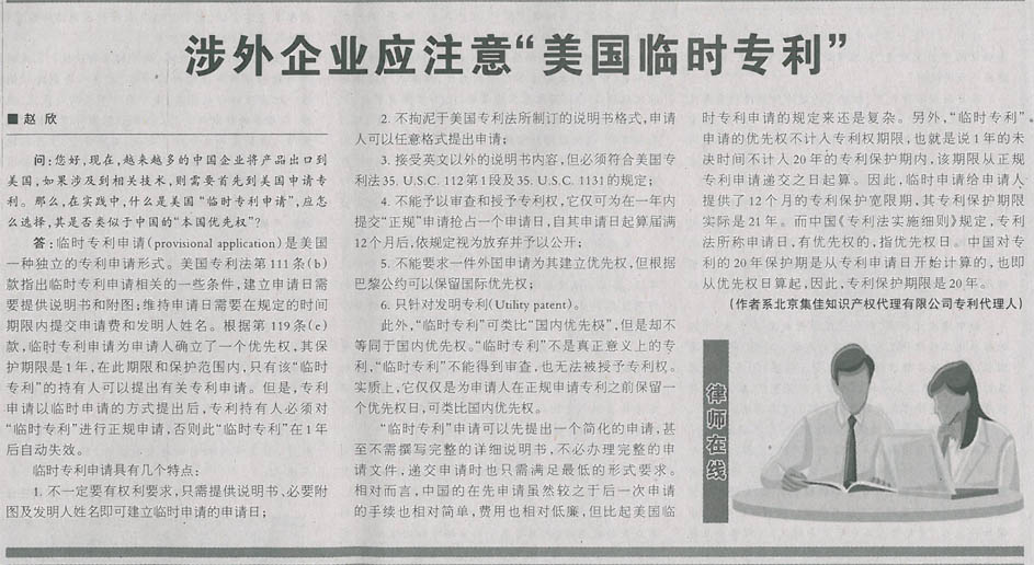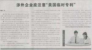 集佳代理人撰文《涉外企業(yè)應(yīng)注意“美國臨時專利”》在《中國貿(mào)易報》發(fā)表