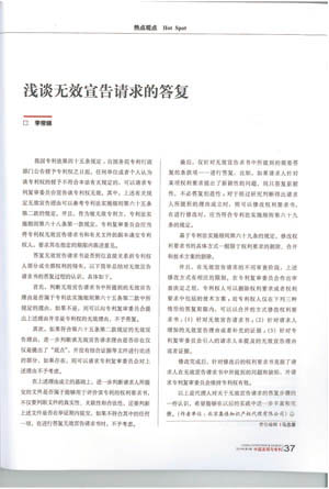 集佳代理人文章《淺談無效宣告請求的答復》在《中國發明與專利》發表