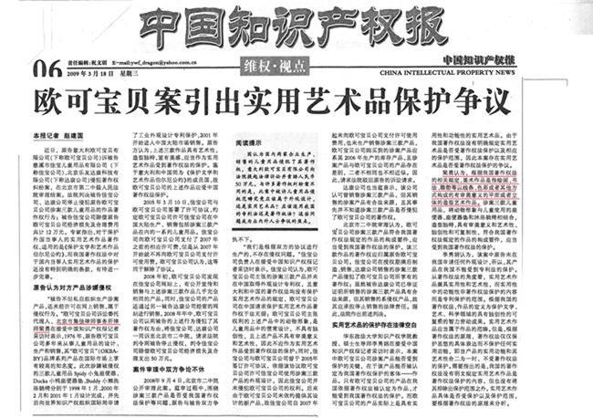 《中國知識產(chǎn)權(quán)報》:歐可寶貝案引出實用藝術(shù)品保護爭議