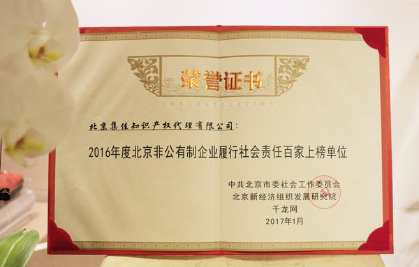 1月7日上午,由北京市委社會(huì)工委、北京新經(jīng)濟(jì)組織發(fā)展研究院、千龍網(wǎng)聯(lián)合組織的第二屆新經(jīng)濟(jì)組織發(fā)展高峰論壇暨首屆北京非公有制企業(yè)履行社會(huì)責(zé)任百家上榜單位發(fā)布會(huì)在首都經(jīng)貿(mào)大學(xué)隆重舉行,會(huì)上,北京集佳知識(shí)產(chǎn)權(quán)代理有限公司等100家履行社會(huì)責(zé)任表現(xiàn)突出的非公企業(yè)受到表彰。此前,《北京日?qǐng)?bào)》整版刊發(fā)了百家上榜企業(yè)名單。