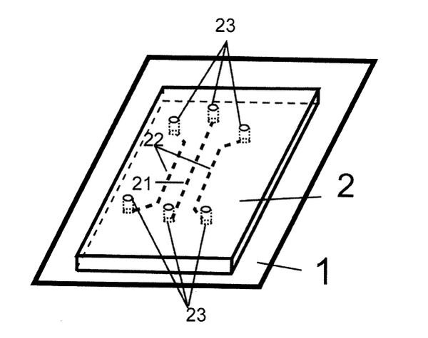 所述基底上表面上附著的蛋白條帶與所述聚二甲基硅氧烷印章的直線型中間凹槽和直線型側凹槽相交不重合。其裝置附圖如下(圖中21、22虛線即為凹槽,蛋白條帶未在圖中標出,可直接理解為與21、22虛線垂直相交):