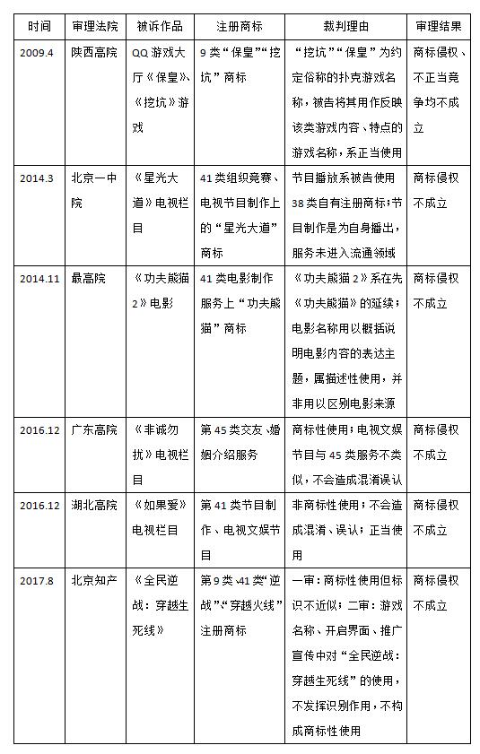 在已決案例中,一部作品的名稱——作品的類型無論是影視節目還是游戲——如果和在先注冊的商標重合了,很少認定商標侵權成立的,理由大概有三種:第一,作品名稱并非商標性使用,比如被訴侵權的《功夫熊貓》電影、《如果愛》電視欄目、《全民逆戰——穿越生死線》游戲;第二,作品與在先注冊商標核定的商品或服務不類似,比如被訴侵權的《星光大道》電視欄目、《非誠勿擾》電視欄目;第三,在先注冊商標標識,相對于作品的內容、主題等特點來說具有直接的描述性,不能禁止他人正當使用,比如被訴侵權的《挖坑》、《保皇》游戲。商品類似問題和正當使用問題,涉及到商標標識及作品的諸多具體細節,個案性很強;但商標性使用問題,幾乎是所有涉及這類沖突的案件中難以繞開的爭議焦點。本文附表二,總結了各地法院對此類案件的審理情況。