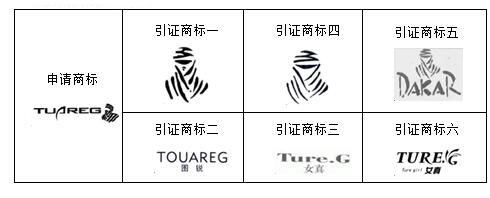 經(jīng)評審認為,申請商標與商標局駁回時所引證的第5110766號圖形商標(以下稱引證商標一)、第4100562號“圖銳TOUAREG”商標(以下稱引證商標二)、第1741769號“女真Ture.G”商標(以下稱引證商標三)、第3882012號圖形商標(以下稱引證商標四)、國際注冊第606861號“DAKAR及圖”商標(以下稱引證商標五)、第9487138號“女真TURE.G Ture gir1及圖” 商標(以下稱引證商標六)在文字構(gòu)成、呼叫上存在一定差異,未構(gòu)成使用在同一種或類似商品上的近似商標。依照《中華人民共和國商標法》第二十八條的規(guī)定,最終決定:申請商標的注冊申請予以初步審定。