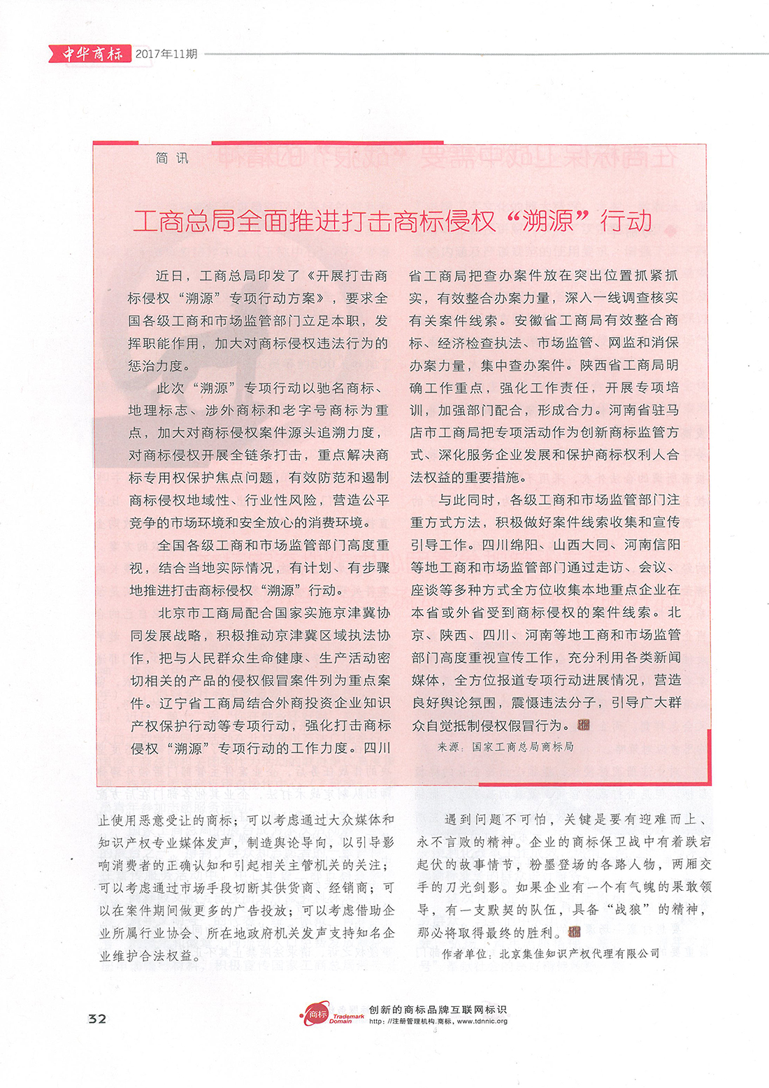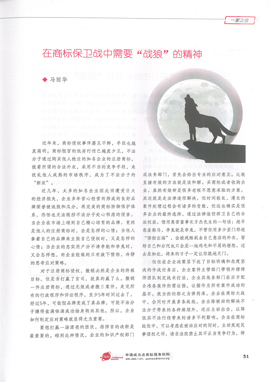 集佳文章《在商標保衛(wèi)戰(zhàn)中需要“戰(zhàn)狼”的精神》在《中華商標》發(fā)表