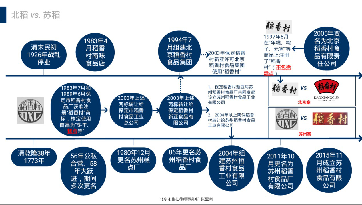 10月12日,蘇州稻香村在一審中獲得勝訴,北京稻香村被判停止在糕點類商品上使用“稻香村”標識,并賠償蘇稻115萬元。而就在一個月前的9月10日,北京知識產權法院判決,北京蘇稻公司、蘇州稻香村公司停止在“粽子、月餅、糕點”等商品上使用“稻香村”商標,賠償原告北京稻香村公司經濟損失及合理費用3000萬元。為何北京、蘇州兩個法院判決”相反“?北京稻香村和蘇州稻香村真有“冒牌貨”?十多年的商標戰,誰勝誰負?北京時間獨家邀請知識產權方面知名律師張亞洲,詳解南北稻香村商標戰。