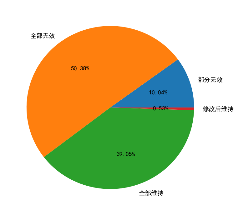 本次共收集專利無(wú)效宣告請(qǐng)求審查決定30178篇(至少有部分關(guān)鍵數(shù)據(jù)有效,包括2008年之前案件),其中宣告專利權(quán)全部無(wú)效(下簡(jiǎn)稱全部無(wú)效)的決定15203篇,占比50.4%,宣告專利權(quán)部分無(wú)效(下簡(jiǎn)稱部分無(wú)效)的決定3031篇,占比10.0%,宣告維持專利權(quán)有效(下簡(jiǎn)稱全部維持)的決定11783篇,占比39.0%,在修改的基礎(chǔ)上維持專利權(quán)有效(下簡(jiǎn)稱修改后維持)的決定161篇,占比0.5%。可見(jiàn),在超過(guò)60%的無(wú)效宣告請(qǐng)求中,都有至少部分權(quán)利要求被宣告無(wú)效。