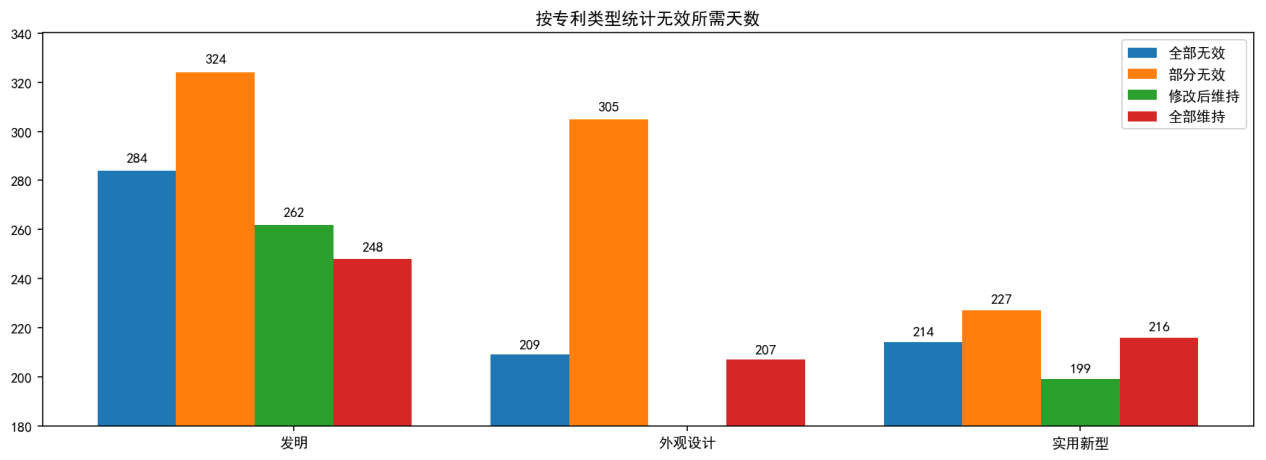 上圖為按專利類型統(tǒng)計(jì)的無(wú)效請(qǐng)求作出決定平均所用天數(shù)。總體上看,發(fā)明專利無(wú)效決定的用時(shí)要多于外觀設(shè)計(jì)專利和實(shí)用新型專利,其中,每一類型下都是部分維持的決定耗時(shí)最久。這可能是由于與全部維持或者全部無(wú)效相比,部分維持的案件可能相對(duì)更加復(fù)雜,更難以作出決定。