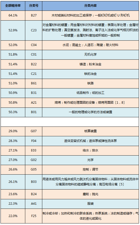 總體上看,無(wú)機(jī)材料(如木材、金屬、水泥等)及其加工(如鍍覆、表面處理等)等較為基礎(chǔ)的領(lǐng)域無(wú)效請(qǐng)求的全部維持率相對(duì)較高;而光電等的具體應(yīng)用領(lǐng)域無(wú)效請(qǐng)求的全部維持率相對(duì)較低。