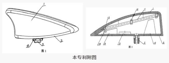 該專利的權利要求1內容為“一種鯊魚鰭式天線,其特征在于具有天線外殼,天線外殼內側上部設置有無線電接收天線,無線電接收天線一端設有天線信號輸出端,天線信號輸出端通過天線連接元件與天線放大器信號輸入端相連接,或直接與同軸電纜匹配相連,天線外殼底部裝有安裝底板;所述無線電接收天線通過注塑嵌裝或固定卡裝在天線外殼內側上部;在天線外殼內側上部設置有無線電接收天線,所述無線電接收天線采用螺旋狀彈簧天線、或金屬天線,增加了天線接收無線電信號的有效長度,實現360度全向性信號接收;所述無線電接收天線為AM/FM共用天線。”