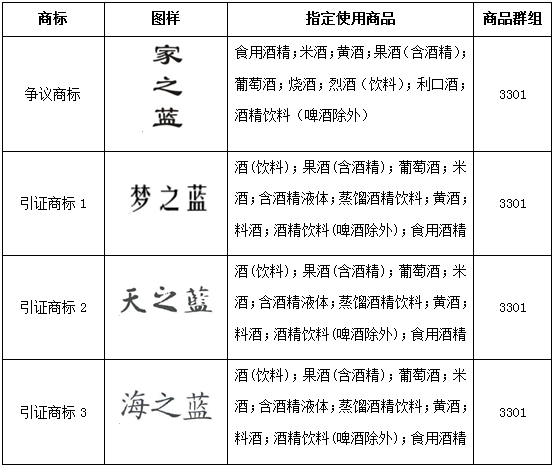 洋河公司針對下述“家之藍”商標提出了無效宣告,主要的理由是認為“家之藍”與引證商標“夢之藍”“天之藍”“海之藍”近似。