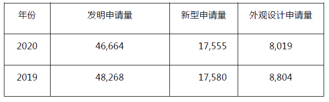 根據(jù)公布情況來(lái)看,中國(guó)臺(tái)灣智慧財(cái)產(chǎn)局2020年共受理72,238件發(fā)明專利申請(qǐng),比2019年減少3.2%;其中受理發(fā)明專利申請(qǐng)46,664件,比2019年減少3.3%;受理新型專利申請(qǐng)17,555件,與2019年持平;受理外觀設(shè)計(jì)專利申請(qǐng)8,019件,比2019年減少8.9%。具體見下表: