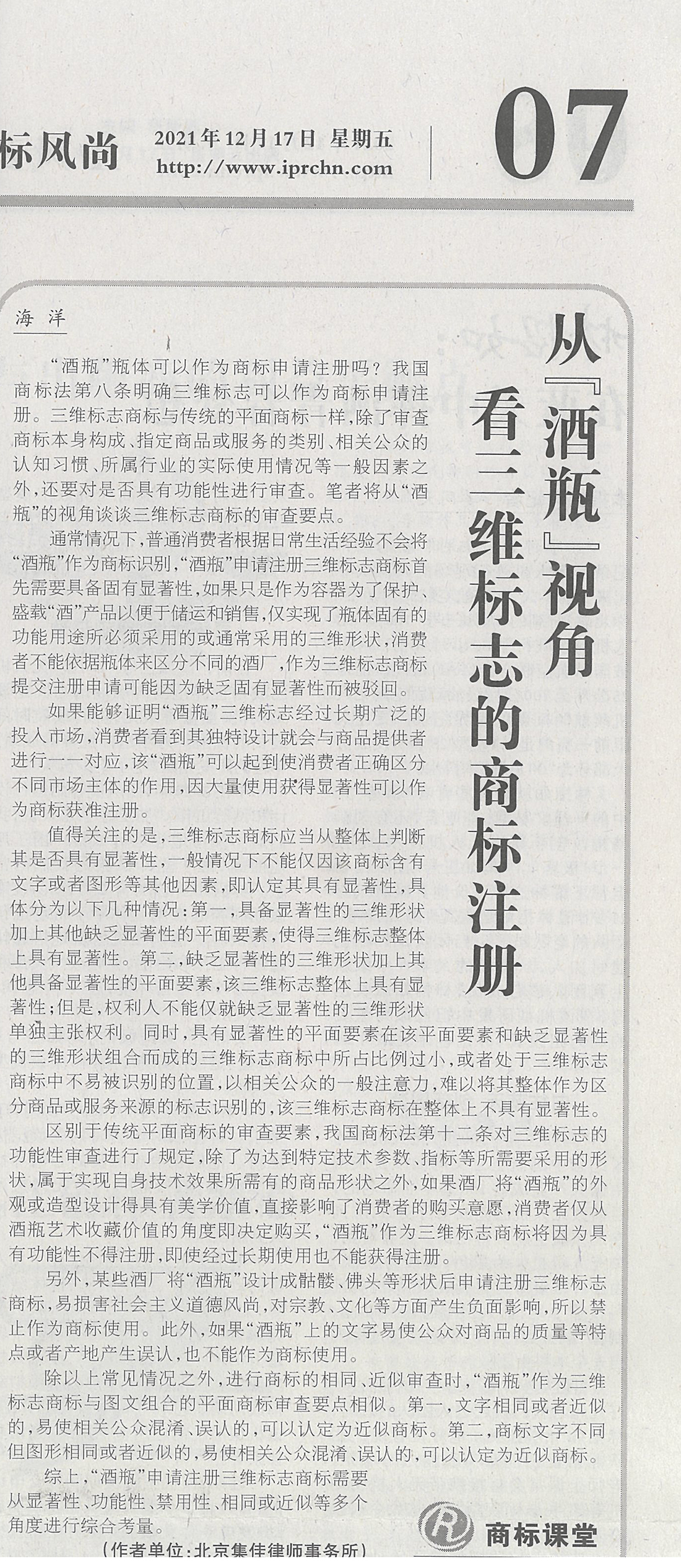 集佳文章《從「酒瓶」視角看三維標志的商標注冊》在《中國知識產權報》發表