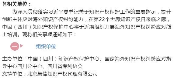 2022年4月20日,由中國(guó)(四川)知識(shí)產(chǎn)權(quán)保護(hù)中心、國(guó)家海外知識(shí)產(chǎn)權(quán)糾紛應(yīng)對(duì)指導(dǎo)中心四川分中心、四川省專(zhuān)利協(xié)會(huì)主辦,北京集佳知識(shí)產(chǎn)權(quán)代理有限公司協(xié)辦的“中國(guó)企業(yè)如何有效應(yīng)對(duì)海外專(zhuān)利糾紛”專(zhuān)題培訓(xùn)線上分享會(huì)成功舉辦。