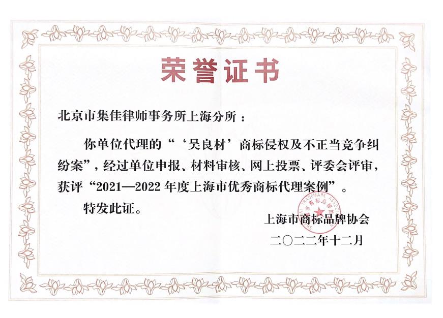 集佳上海分所代理的“吳良材”商標(biāo)侵權(quán)及不正當(dāng)競爭糾紛案被評為“2021-2022年度上海市優(yōu)秀商標(biāo)代理案例”。“吳良材”案歷經(jīng)一審、二審、再審審查、抗訴審查程序,耗時(shí)六年,終于落下了帷幕。本案司法機(jī)關(guān)所遵循的“尊重歷史、禁止混淆、誠實(shí)信用、利益平衡”的老字號知識產(chǎn)權(quán)司法保護(hù)理念,既尊重歷史所形成的事實(shí),為被告保留相應(yīng)發(fā)展空間,又依據(jù)商標(biāo)法的規(guī)定合理保護(hù)注冊商標(biāo)專用權(quán),禁止混淆性使用,具有相當(dāng)?shù)牡湫鸵饬x。