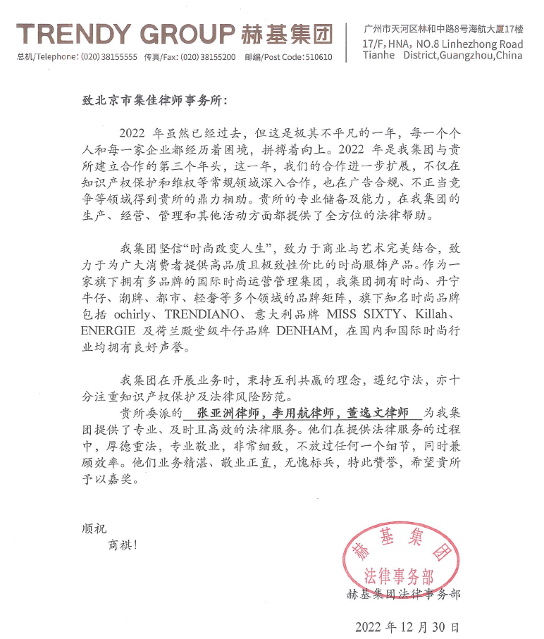 At the beginning of the new year, Unitalen received a warm commendation letter from the client Trendy Group. In the letter, Trendy Group highly recognized Unitalen's high-quality service and exquisite business in the fields of intellectual property protection and rights protection, advertising compliance, unfair competition, and highly praised the serious and responsible work attitude of Unitalen professionals such as ZHANG Yazhou, LI Yonghang, DONG Yiwen, CHANG Baoliang, DAI Jian, and MA Weifeng, speaking highly of them in the process of providing legal services for their morality and emphasis on law, professionalism and efficiency, dedication and integrity. They are worth of the role model!