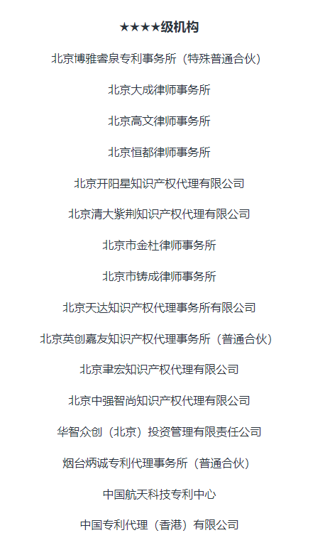 首都知識產權服務業協會本次等級評定工作遵循公開、公正、透明的原則,嚴格按照標準評分要求,根據機構所提交材料信息及其完整度進行評定。經評審工作組初審、復審,專家書面評審及理事會審議,最終確定2023年度知識產權服務機構等級評定結果,其中AAAAA級機構19家,AAAA級機構16家,AAA級機構16家,AA級機構9家。