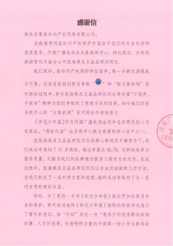 感謝信中提到,集佳工作人員在為客戶爭取“陽光少年報”系列商標過程中精心籌劃、不懈努力,取得了意想不到的成果,成功申請到31件商標,通過率高達96.7%。同時,《陽光少年報》作為河南廣播電視臺的知名品牌及核心文化商品,為了更進一步對其開展具體及專業的保護,集佳成功將《陽光少年報》獨特的排版形式進行了著作權登記,對這份“用孩子的視角解讀新聞時事、人文科技等,傳遞榜樣力量的中國第一份小學生新聞故事報”從多角度進行了有效的法律保護,進一步鞏固了該份報紙的市場地位。這些努力在一定程度上為未來“大象新聞”品牌的發展奠定了更加堅實的基礎,也為客戶未來的商標戰略鋪平道路。對此,客戶對集佳表達誠摯感謝與加深合作的美好期望!