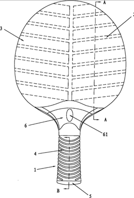 一種乒乓球拍,包括手柄1、底板2和位于底板上的彈性面板3,其特征在于:所述手柄1和底板2由塑料材料和玻璃纖維注塑成型制成,彈性面板3與底板通過注塑的方法固定連接在一起,手柄1的表面注塑有天然橡膠、人工橡膠、硅膠或塑料膠粒制成的防滑層4;所述彈性面板3由天然橡膠、人工橡膠、硅膠或塑料膠粒制成;所述制成底板2的塑料材料是PP、ABS或聚丙烯;所述塑料膠料為PPE、PU、TPU、EPDM或POE。