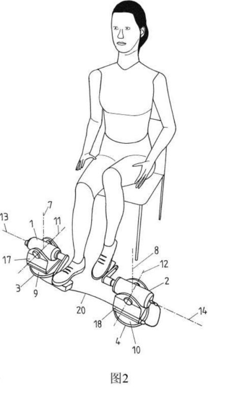 再者,對(duì)比文件3中完全沒有公開左右兩個(gè)曲柄軸42能夠單獨(dú)地通過中間元件來調(diào)節(jié)。對(duì)比文件3沒有公開各個(gè)曲柄軸對(duì)于待訓(xùn)練的患者的相應(yīng)的生理需求的單獨(dú)的可調(diào)節(jié)性。相反,對(duì)比文件3公開了用于患者的左腳和右腳的左右兩個(gè)曲柄軸的共同的調(diào)節(jié)方案。因此,對(duì)比文件3中沒有公開修改后的權(quán)利要求1中的“第一運(yùn)動(dòng)元件(1)設(shè)置在第一基礎(chǔ)元件(3)上,并且第二運(yùn)動(dòng)元件(2)設(shè)置在第二基礎(chǔ)元件(4)上,其中所述第一基礎(chǔ)元件(3)和所述第二基礎(chǔ)元件(4)在機(jī)械上完全彼此分開”。