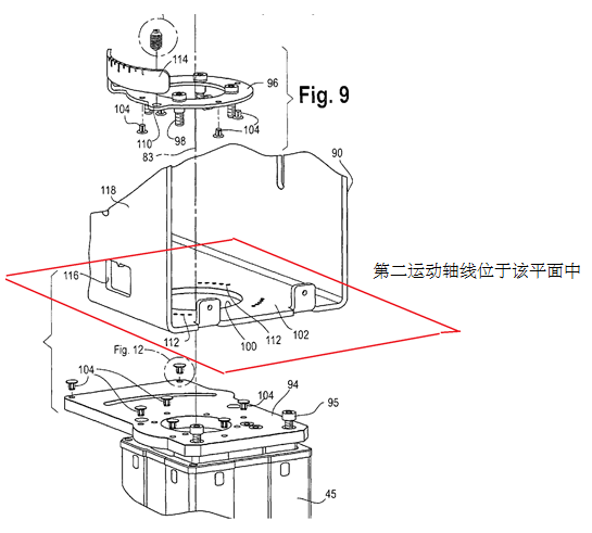 從對(duì)比文件4的圖9中可以看到,第二運(yùn)動(dòng)軸線位于紅色線框所示出的平面中。然而,螺釘98的肩部接合開口100的邊緣以將殼體90定位在該平面中。顯然,殼體90根本不可能圍繞該平面中的任何軸線轉(zhuǎn)動(dòng)。也就是說,對(duì)比文件4并沒有公開案例的權(quán)利要求1中的技術(shù)特征“運(yùn)動(dòng)元件(1,2)能夠相對(duì)于相應(yīng)的中間元件(17,18)彼此無關(guān)地圍繞第二運(yùn)動(dòng)軸線(11,12)運(yùn)動(dòng)”。
